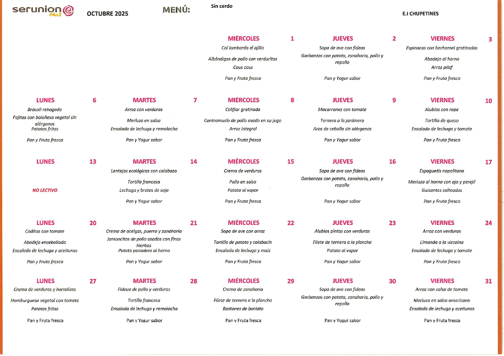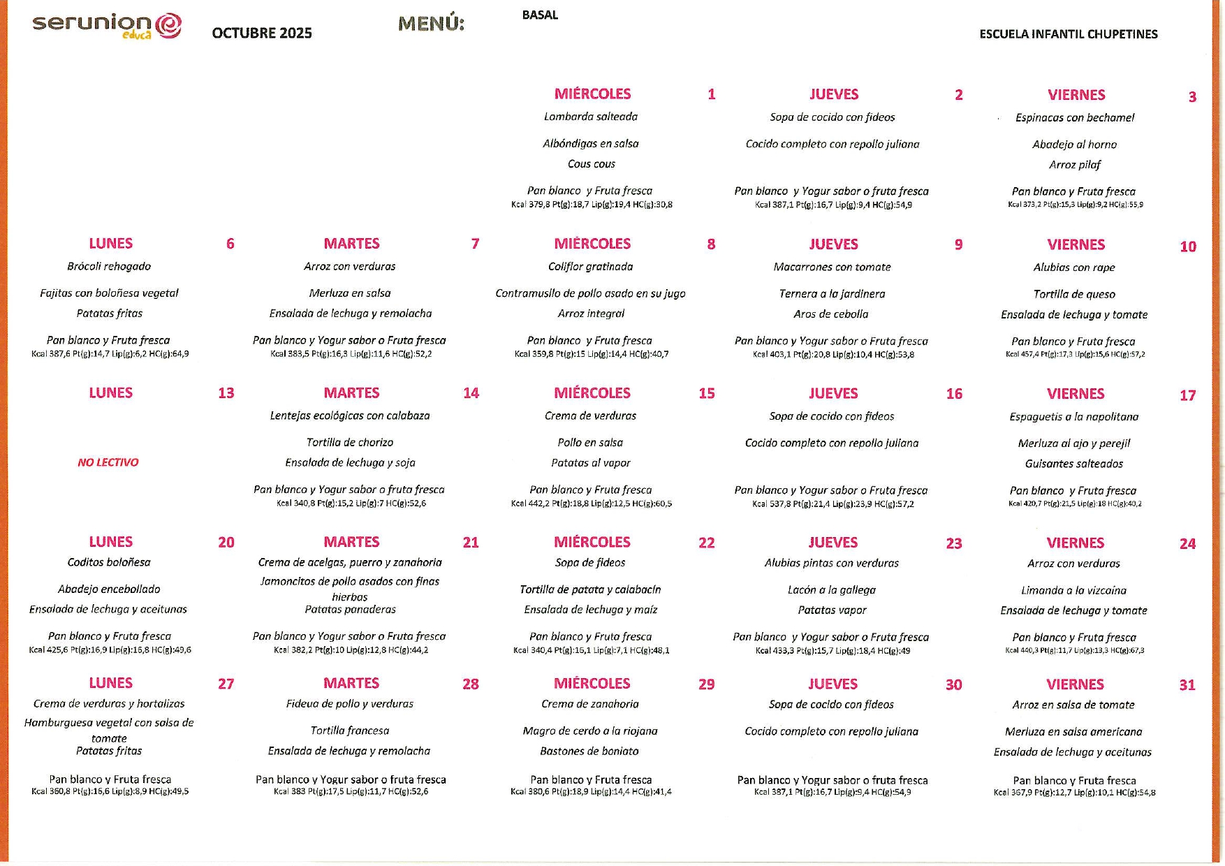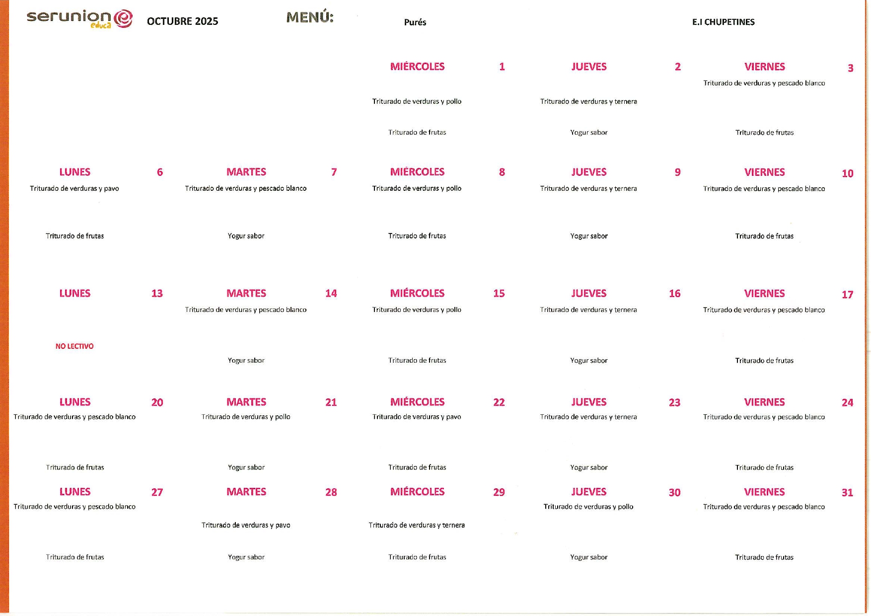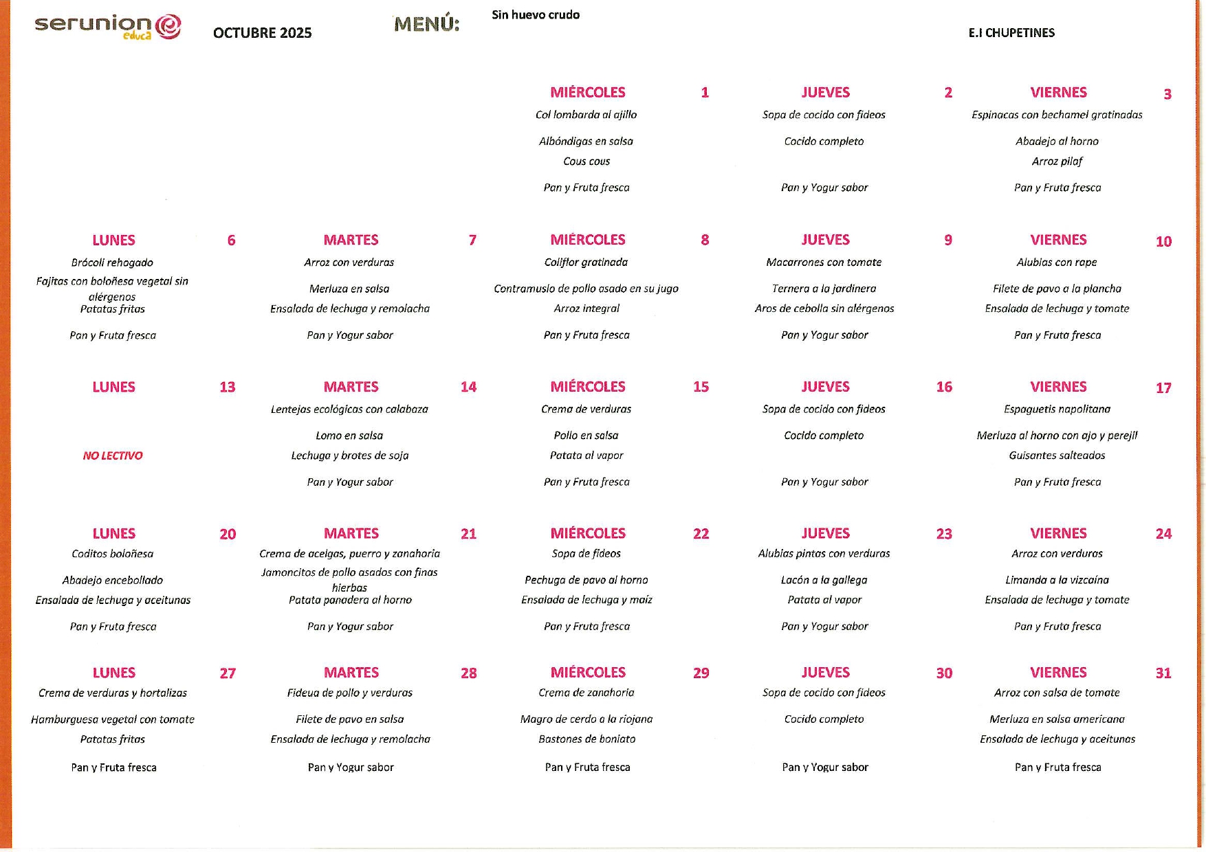 Contamos con el servicio de la empresa SERUNION, que nos ofrece una comida sana, equilibrada y saludable con productos e ingredientes de primera calidad.